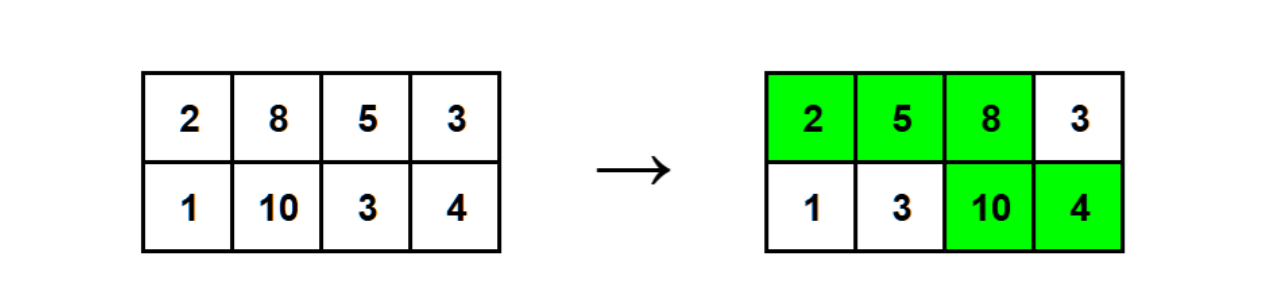 wl初始站在(1,1),终点在(2,n)的位置,wl需要选择一条路径从(1,1)走到(2,n)。为了能够尽可能多的获取金币,《掘区灵》官方给了玩家一个可以无限使用的能力,这个能力为:每次可以选择任意两列,然后交换这两列的值,例如你选择了第x,y两列,那么会对调a1,x与a1,y的值以及对调a2,x与a2,y的值。wl有点笨,他根本不知道这个能力有多厉害!现在请你帮他使用这个能力并选择一条路径使得wl最终能够获得的金币数目最多。